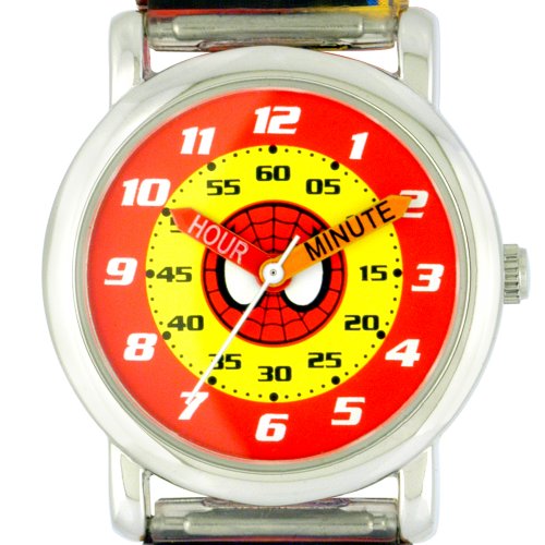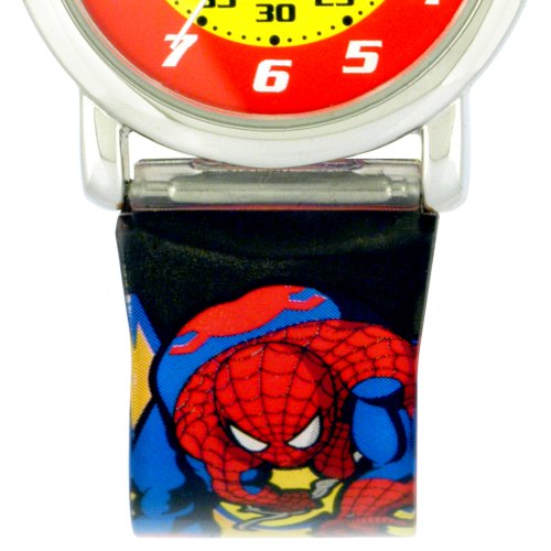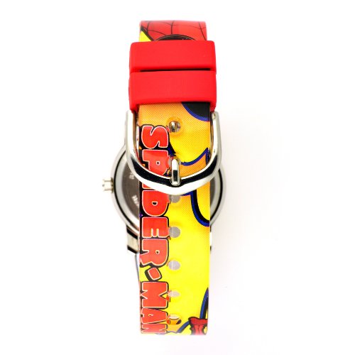 Learn a fun way to tell time, Spider-Man Marvel Comics Kids' yellow and black character shows a nice easy to read colored dial with a picture of Spiderman in the middle. The dial includes large indexes of Arabic numerals around the outer circumference and minute indexes on the inner suburbs. Hands in bold, red and gold "ore" and "minutes" printed on each hand a useful educational tool. Spiderman fans love the stylish graphic design printed on the wristband that is secured by a buckle. A durable plastic bezel and the glass protects the watch wear. The Marvel Comics Kids' Spiderman yellow and black easy to read characters watch is powered by a reliable quartz movement.